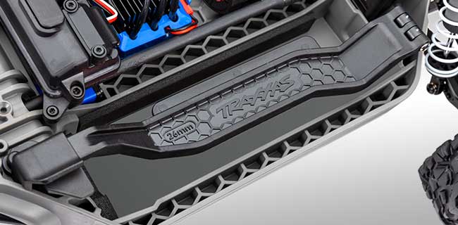 Rustler 4X4, güvenli montaj ve tek elle hızlı sökme ve takma için klipssiz gövde kilitleme sistemi kullanır. Şık, aerodinamik gövde, uzun ömür ve Traxxas-ToughTM dayanıklılığı için sağlam bir iç yapıya ve harici devrilme korumasına sahiptir.